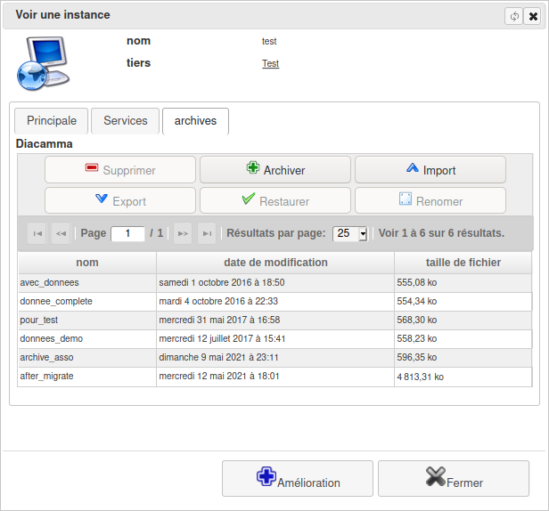 Depuis la fiche de votre instance d'hébergement (Bouton "Vos instances d'hébergement") vous avez possibilité de gérer les archives Diacamma de votre instance. 6 boutons de gestion sur les archives vous sont proposés: